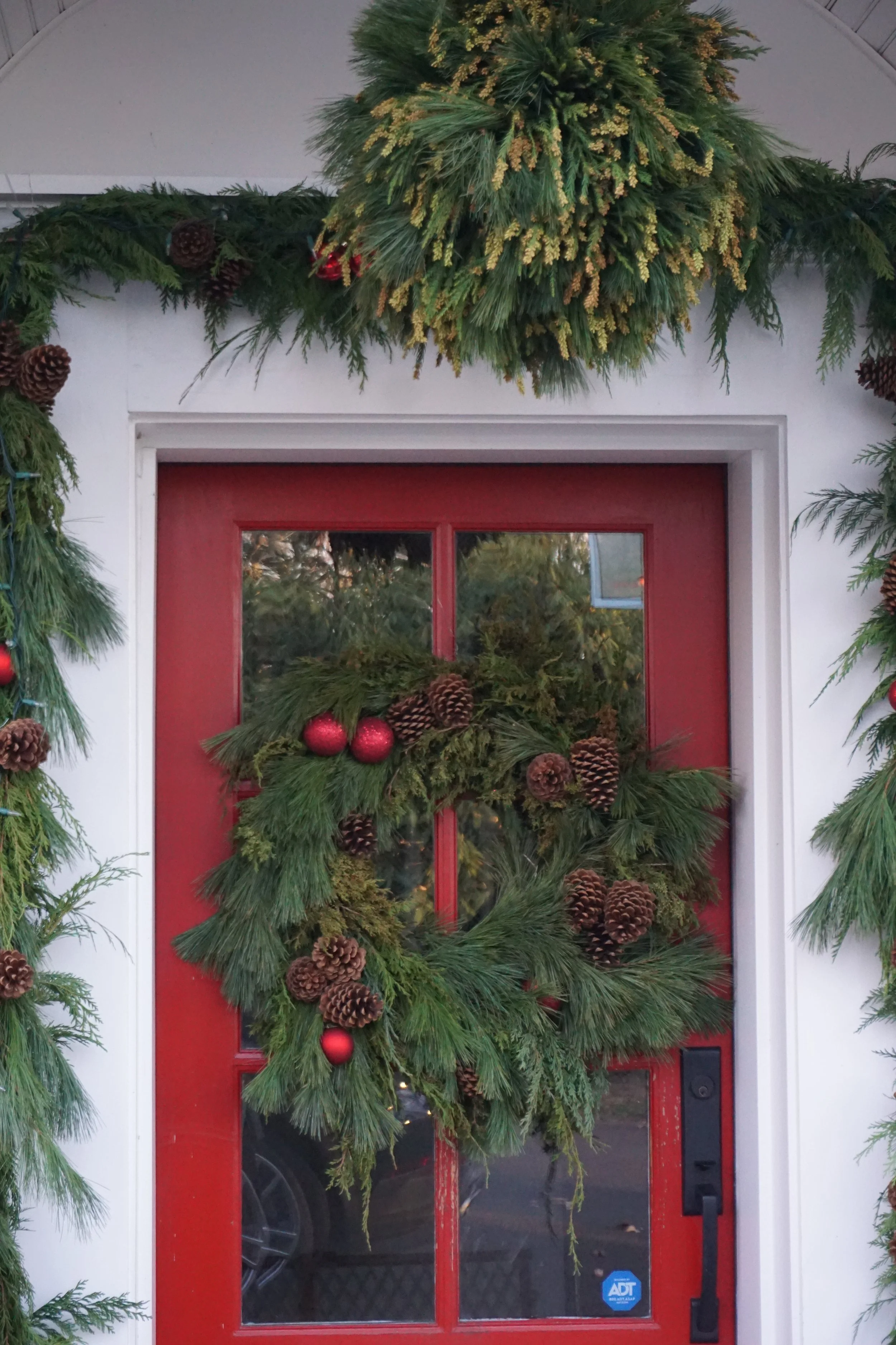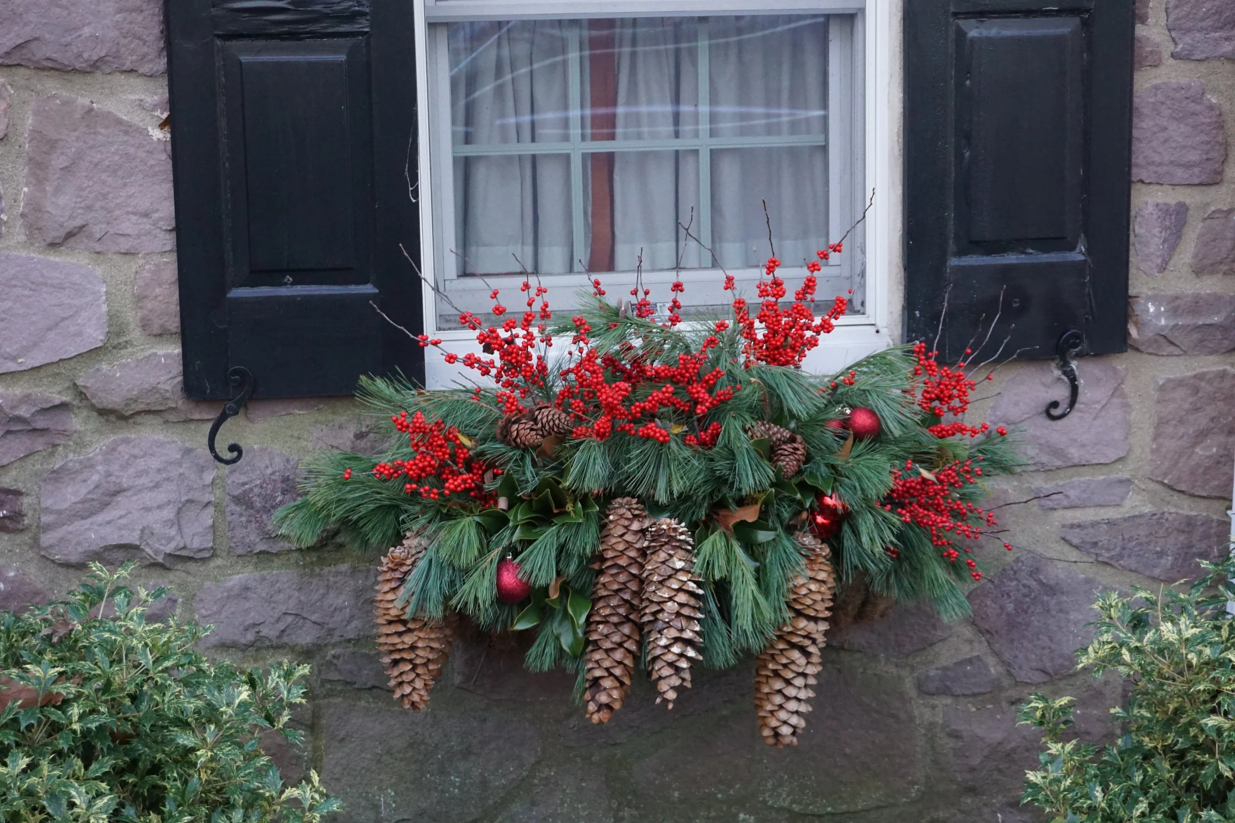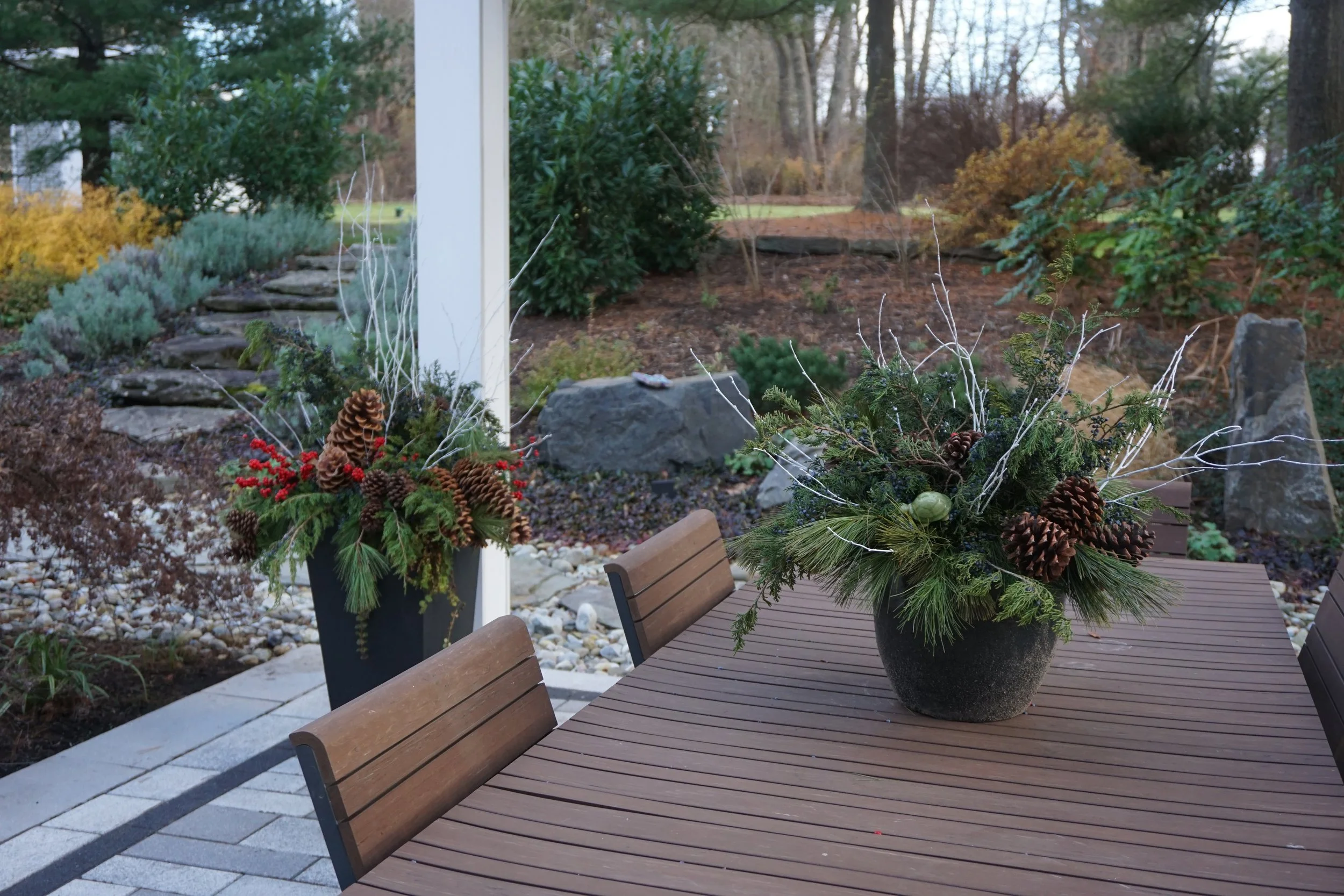 Decorative holiday centerpieces with pinecones, greenery, and red berries on an outdoor table